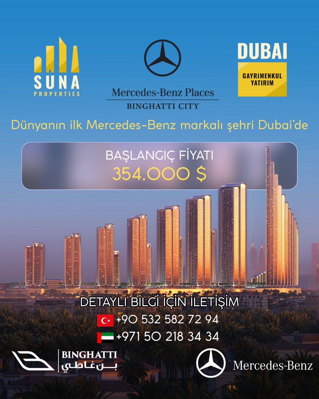 Dünyanın ilk Mercedes-Benz markalı şehri olan ve Dubai’de lüks yaşamı yeniden tanımlayan Mercedes-Benz Places Binghatti City için resmi lansman fiyatlarını ve özel erken erişim tekliflerini duyurmaktan mutluluk duyuyoruz.